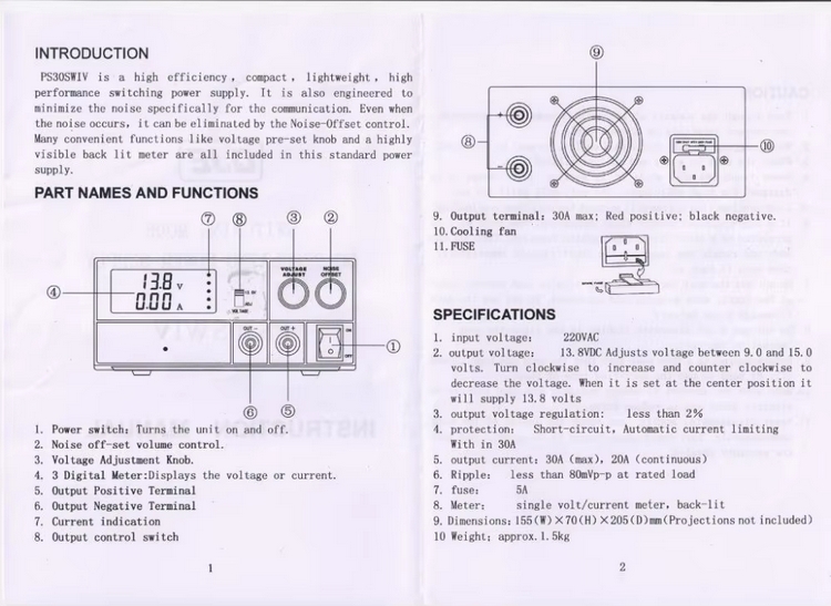Se puede dejar fija en 13.8V de salida, o se puede variar entre 9 y 15V, corriente máxima comprobada de 30 Amperes en una radio SSB.